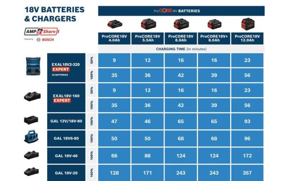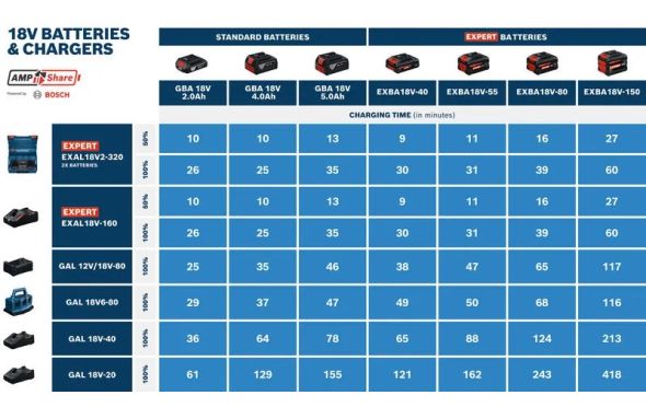 - Ο υπερταχυφορτιστής EXPERT EXAL18V-160 χρειάζεται μόνο 39 λεπτά για την πλήρη φόρτιση μιας μπαταρίας EXBA18V-80, χάρη στο ρεύμα φόρτισης των 16 A.
