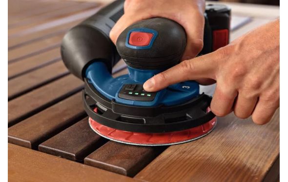 - Το GEX 18V-150-3 Professional διαθέτει δοχείο σκόνης, επιλογή ταχύτητας, ένδειξη κατάστασης της μπαταρίας και δακτύλιο προστασίας, καθώς και πέλμα λείανσης 150 mm.