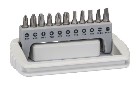 | Περιεχόμενο σετ: PH1 / PH2 / PH3 / PZ1 / PZ2 / PZ3 / T15 / T20 / T25 / S0,6x4,5 / S0,8x5,5 / Στήριγμα γενικής χρήσης Quick Release |