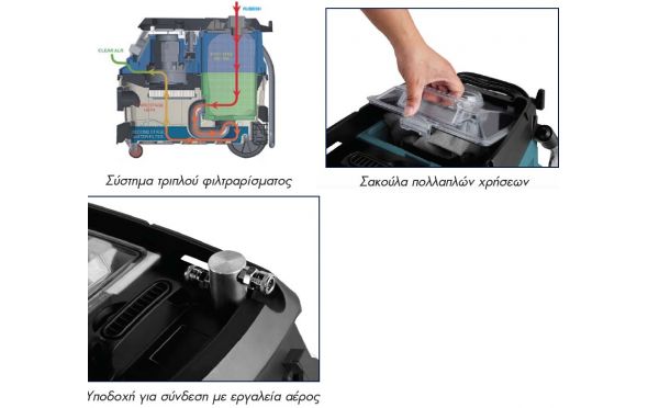 - Σύστημα τριπλού φιλτραρίσματος - Σακούλα (πρώτο στάδιο), Φιλτράρισμα με νερό (δεύτερο στάδιο), Φίλτρο HEPA (Τρίτο στάδιο).