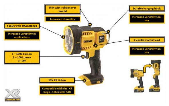 DEWALT - DCL043 Φακός Led 1000Lumens - Χωρίς Μπαταρία & Φορτιστή (Solo)