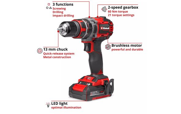 - Το κρουστικό δραπανοκατσάβιδο μπαταρίας Einhell TP-CD 18/60 Li-i Brushless τροφοδοτείται από τον κινητήρα χωρίς ψήκτρες Einhell PurePOWER.