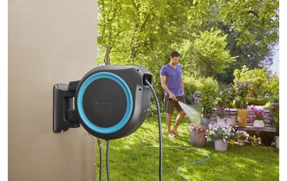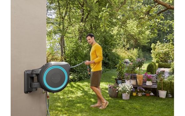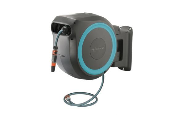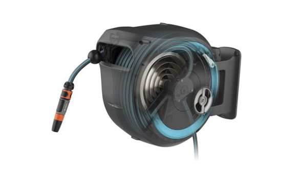 - Το καρούλι είναι εξοπλισμένο με προστασία από κλοπή. Διαθέτει επίσης όλα τα απαραίτητα εξαρτήματα σύνδεσης: βάση στήριξης τοίχου, λάστιχο σύνδεσης,και τα αυθεντικά εξαρτήματα συστήματος και συναρμολόγησης GARDENA καθώς και ακροφύσιο με δύο διαφορετικές επιλογές ψεκασμού.