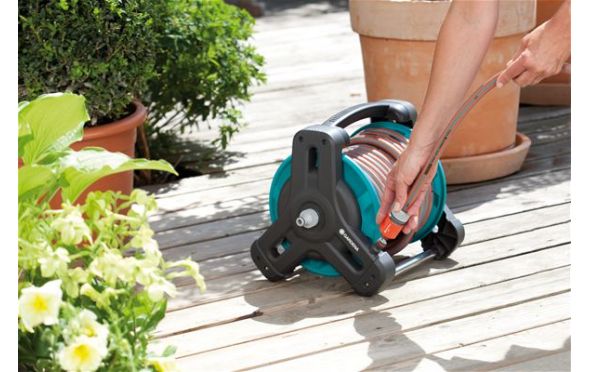 Επομένως, είναι ιδανικό για πολύ μικρούς κήπους, αίθρια ή μπαλκόνια. Χάρη στην εργονομική λαβή, μπορεί επίσης να μεταφερθεί άνετα και να χρησιμοποιηθεί οπουδήποτε. Διαθέτει μανιβέλα ελεύθερης κίνησης για εύκολο χειρισμό του καρουλιού. Μπορείτε επίσης να αναδιπλώσετε τη μανιβέλα. Έτσι, το καρούλι αποθηκεύεται σε ελάχιστο χώρο.
