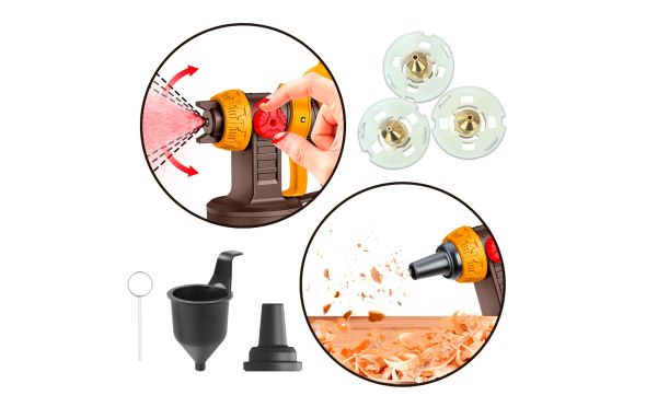 Ρυθμιζόμενο πλάτος ψεκασμού.Λειτουργία φυσητήρα.Με το πάτημα ενός κουμπιού διαιρείται στα δυο (μπέκ και κινητήρας) για τον καλύτερο καθαρισμό του μπεκ χωρίς να έρχεται σε επαφή με υγρά καθαρισμού ο κινητήρας.Το εργαλείο προορίζεται για βαφή, με χρώματα με βάση διαλύτες και με βάση το νερό, αστάρια, χρώματα δύο συστατικών, βερνίκια, χρώματα φινιρίσματος, χρώματα αυτοκινήτων, χρώματα νεφτιού, και συντηρητικά ξύλου. Απαραίτητη προϋπόθεση είναι ένας καλός καθαρισμός μετά από κάθε χρήση.