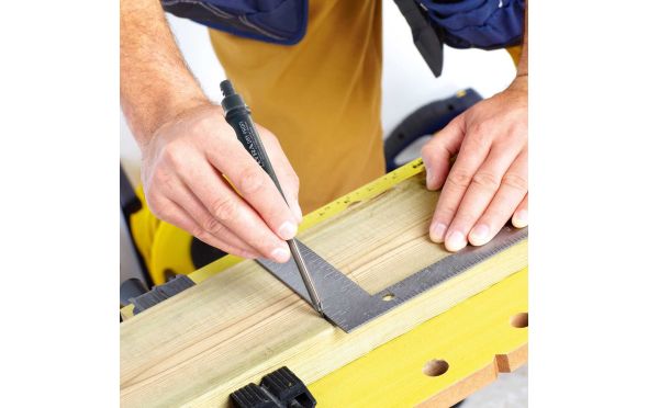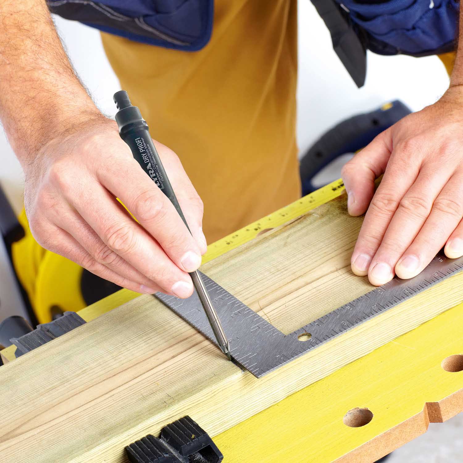 Για επαγγελματική σήμανση σε όλες τις επιφάνειες (ξύλο, μέταλλο, πλαστικό, γυαλί, κεραμικά κ.λπ.). Ο βελτιστοποιημένος μηχανισμός κλιπ επιτρέπει εύκολη χρήση με το ένα χέρι.Ενσωματωμένη ξύστρα και οδηγός για γρήγορο και εύκολο ακόνισμα, ακόμη και όταν το εργαλείο είναι στερεωμένο στην τσέπη του παντελονιού.Η ειδική μύτη γραφίτη μπορεί να σβηστεί από λείες επιφάνειες με ένα νωπό πανί.