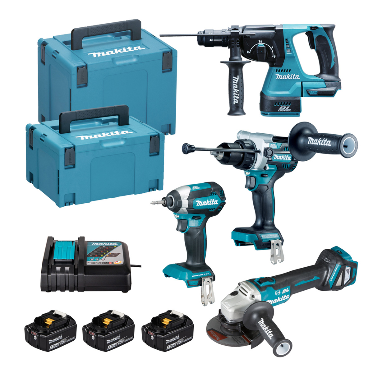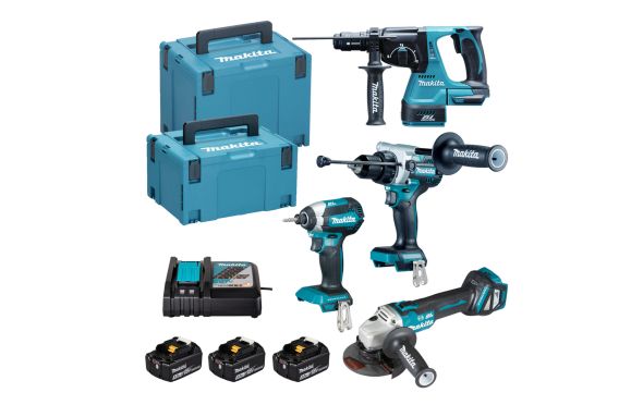 Makita - DLX4192TJ Σετ DHP492 Κρουστικό Δράπανο DTD153 Παλμικό Κατσαβίδι DHR243 Πιστολέτο & DGA513 Γωνιακός Τροχός σε Makpac 18V Li-Ion BL Motor (3x5.0Ah)