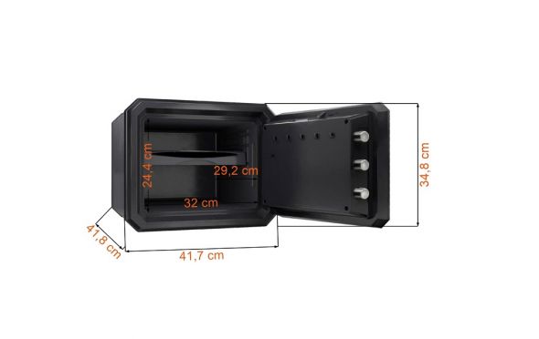 - Οι 3 μεγάλες αυτόματες ατσάλινες μπάρες (60% φαρδύτερες από ένα μέσο χρηματοκιβώτιο), ο ανθεκτικός μεντεσές και η ηλεκτρονική κλειδαριά του, το καθιστούν εξαιρετικά ανθεκτικό στις επιθέσεις.