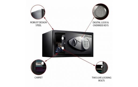 - Η προγραμματιζόμενη ηλεκτρονική κλειδαριά ασφαλείας σάς επιτρέπει να επιλέξετε τον συνδυασμό σας, ενώ το έξτρα κλειδί διασφαλίζει ότι θα έχετε πάντα πρόσβαση στο χρηματοκιβώτιο σας, ακόμα και στην περίπτωση που ξεχάσετε τον συνδυασμό.