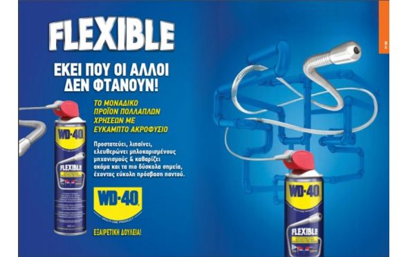 - Σχεδιασμένο για να εξυπηρετεί τον χρήστη, το WD-40 Flexible είναι εφοδιασμένο με ένα ειδικό εύκαμπτο σωληνάκι 18cm το οποίο διατηρεί το σχήμα που του δίνεται.