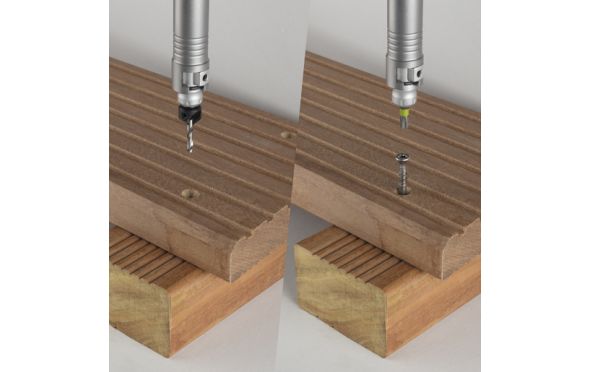 - Για να μπορέσετε να ξεκινήσετε αμέσως, το σετ περιλαμβάνει ήδη 2 εργαλεία για τον εξοπλισμό του στηρίγματος γρήγορης εναλλαγής Duo: ένα τρυπάνι με φρέζα για ξύλο και μία μύτη Torx 25 mm – ο ιδανικός συνδυασμός για την προετοιμασία της οπής και το βίδωμα σε ξύλινες κατασκευές, π.χ. στην τοποθέτηση σανίδων βεράντας.