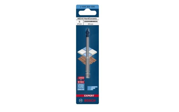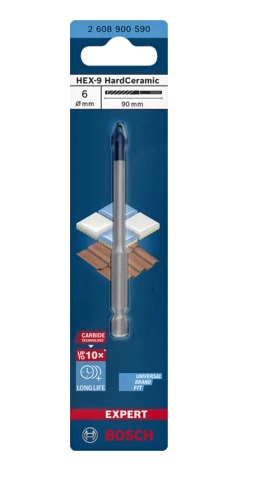 • Το τρυπάνι Bosch EXPERT HEX-9 HardCeramic είναι σχεδιασμένο για τη διάτρηση κεραμικών και μπορεί να ανοίγει τρύπες σε σκληρά πλακίδια, χωρίς λιπαντικό ή ψύξη