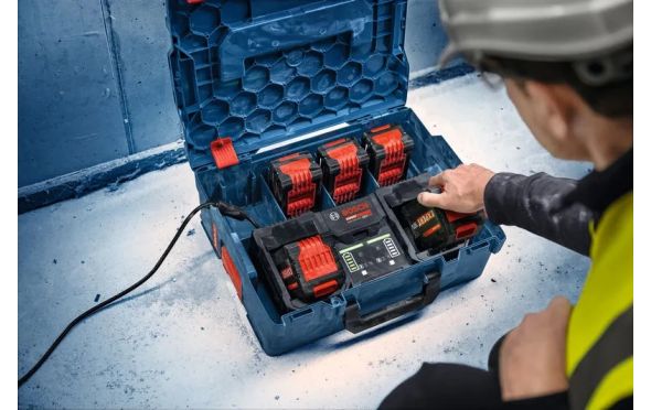 - Χάρη σε ένα ρεύμα φόρτισης 16 A ανά υποδοχή, μπορείς να φορτίσεις πλήρως δύο μπαταρίες EXBA18V-80 σε 39 λεπτά.