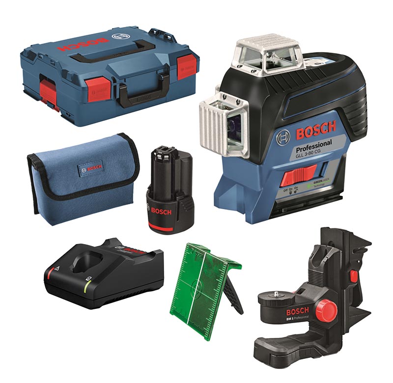Bosch - GLL 3-80 CG Γραμμικό Λέιζερ με Πίνακα Στόχου και Στήριγμα Τοίχου BM1 Πράσινης Προβολής σε L-Boxx (1x2.0Ah) 12V