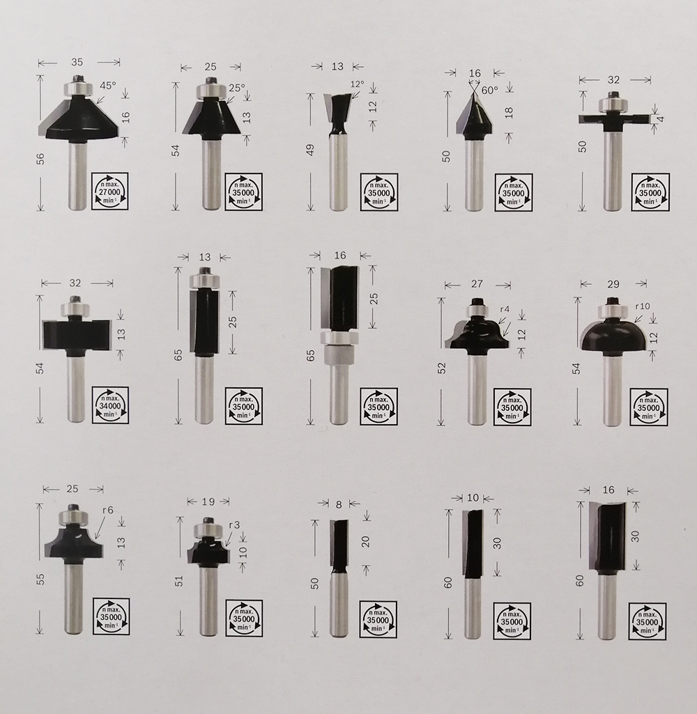 • BOSCH - Σετ Φρέζες για Ρούτερ διάφορες 8mm - 15 Τεμαχίων.