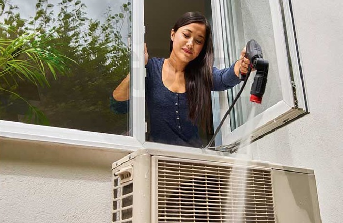 • Αυτό το πολύπλευρο εργαλείο με εξοικονόμηση χρόνου διατίθεται με πιστόλι ψεκασμού 360°, το οποίο με τον χειρισμό ενός χεριού και το περιστρεφόμενο ακροφύσιο μπορεί να χρησιμοποιηθεί υπό γωνία για ξεκούραστη εργασία με εκτόξευση δέσμης ή για απαλό καθαρισμό επίπλων εξωτερικού χώρου ή δυσπρόσιτων σημείων, όπως ψηλά παράθυρα ή το κάτω μέρος των αυτοκινήτων.