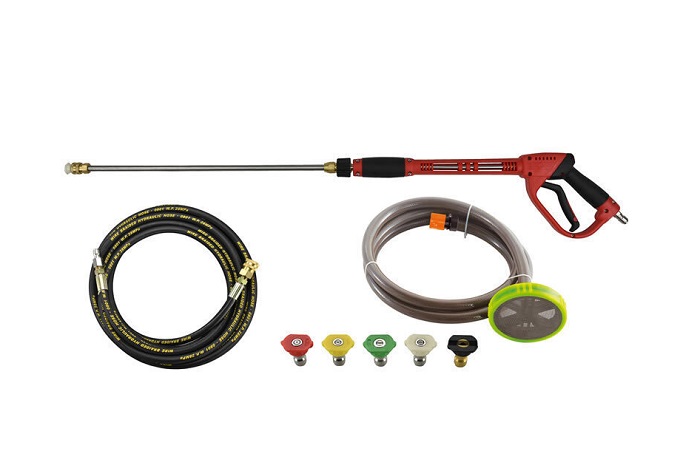 - Με πλήρη εξοπλισμό: επαγγελματικό πιστόλι με σκανδάλη ασφαλείας, σωλήνα υψηλής πίεσης 10 μέτρων, σωλήνα αναρρόφησης απορρυπαντικού, ακροφύσια (0ο, 15ο, 25ο, 40ο και μπεκ απορρυπαντικού), ακροφύσιο σύνδεσης νερού, φίλτρο εισαγωγής νερού.