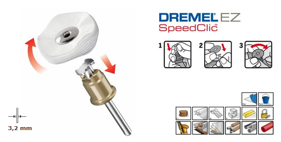Αυτό ο δίσκος είναι ιδανικός για γυάλισμα μετάλλου και πλαστικού. Μπορεί επίσης να χρησιμοποιηθεί με το βιδωτό στέλεχος 402. Γρήγορα, εύκολα, χωρίς κλειδί.