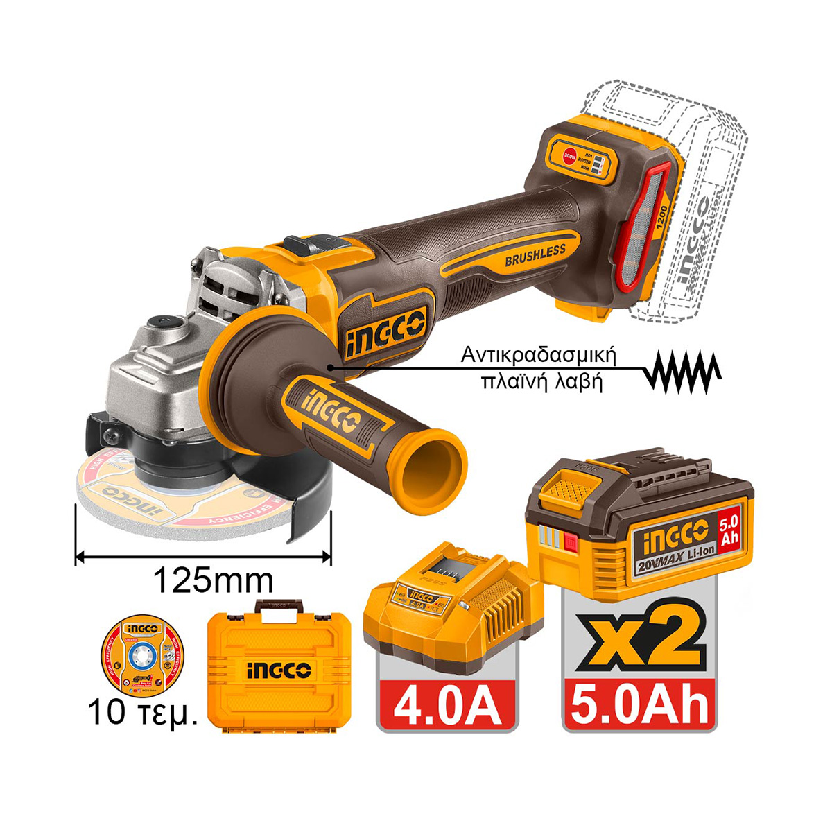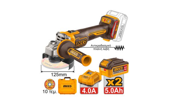 Ingco - CAGLI2120272E Γωνιακός Τροχός Μπαταρίας 125mm 20V Li-Ion Brushless (2x5.0Ah)