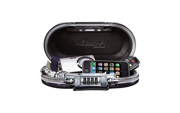 Safe space μαύρο με συνδυασμό 4 ψηφίων, MASTERLOCK. • Ιδανικό για το πανεπιστήμιο, το γραφείο, το σπίτι, τα ταξίδια και την παραλία. Ενα θυσαυροφυλάκιο στην τσάντα σας - Με το Safe Space της Master Lock έχετε τα πράγματα σας ασφαλή όπου και να βρίσκεστε! Εύκολο στη χρήση - Ορίστε τον τετραψήφιο κωδικό σας και ασφαλίστε τα πολύτιμά σας χωρίς να κουβαλάτε κλειδιά. Ελαφρύ και αδιάβροχο - Κλειδώστε το συρματόσχοινο γύρω από την ομπρέλα σας ή την ξαπλώστρα σας και κρατήστε ασφαλείς τις ηλεκτρονικές σας συσκευές ή οτιδήποτε άλλο θέλετε. Με ενσωματωμένο συρματόσχοινο που τυλίγεται γύρω από την κασετίνα ή γύρω από ένα σταθερό σημείο.