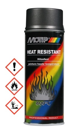 Ειδικό χρώμα που αντέχει σε υψηλές θερμοκρασίες. Κατάλληλο για μηχανές, εξατμίσεις, θερμάστρες, σωλήνες θερμαστρών, ψησταριές κλπ. Διατίθεται μόνο με ματ φινίρισμα. Δεν χρειάζεται αστάρι σε γυμνό μέταλλο. Ανθεκτικό σε θερμοκρασίες έως 800oC . Προσφέρει αντισκωριακή προστασία. Μεγάλης διάρκειας τελικό αποτέλεσμα. Με ανατομική βαλβίδα. 5 χρόνια διάρκεια ζωής στο δοχείο.