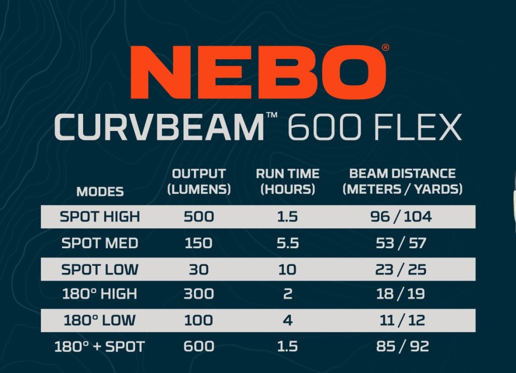 • Ο φακός κεφαλής CURVBEAM™ 600 FLEX της ΝΕΒΟ συνδυάζει ένα ισχυρό εστιασμένο φως με ένα περιμετρικό διάχυτο φως 180°, όλα μαζί σε έναν άνετο, μικρού μεγέθους σχεδιασμό.