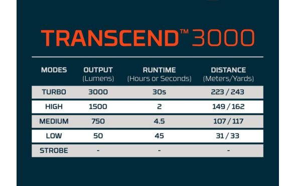 | Turbo (3000 lumens): 30 δευτερόλεπτα* / 223 μέτρα *μετά από 30 δευτερόλεπτα το φως επιστρέφει στη σκάλα που χρησιμοποιήθηκε τελευταία ώστε να αποφευχθεί η υπερθέρμανση και να προστατευτεί η μπαταρία. Η σκάλα Turbo μπορεί να ενεργοποιηθεί ξανά ανά πάσα στιγμή. |