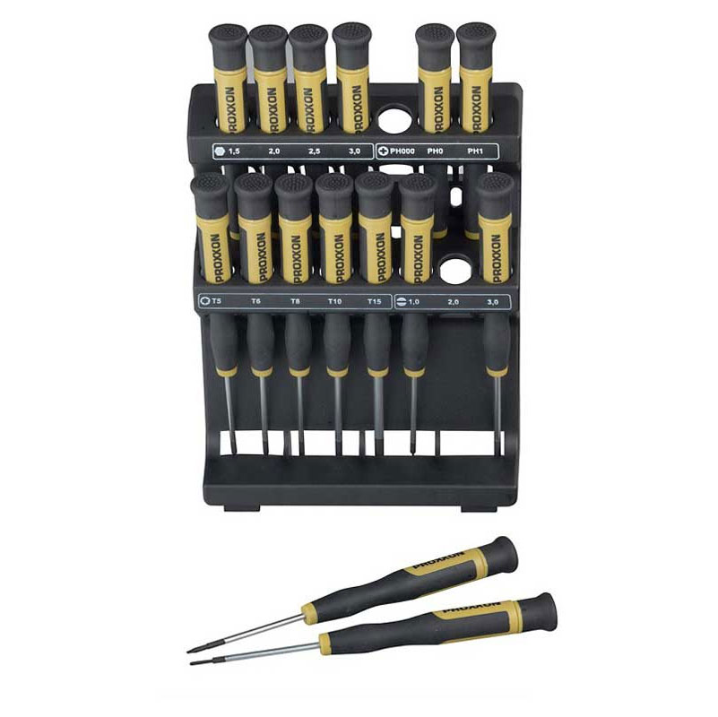 Σετ 15 τεμαχίων κατσαβίδια PROXXON από υψηλής ποιότητας κράμα νικελίου-χρωμίου-μόλυβδου (SAE 8660) και μύτες χρωμίου τύπου Brinell για μέγιστη σκληρότητα και αντοχή.