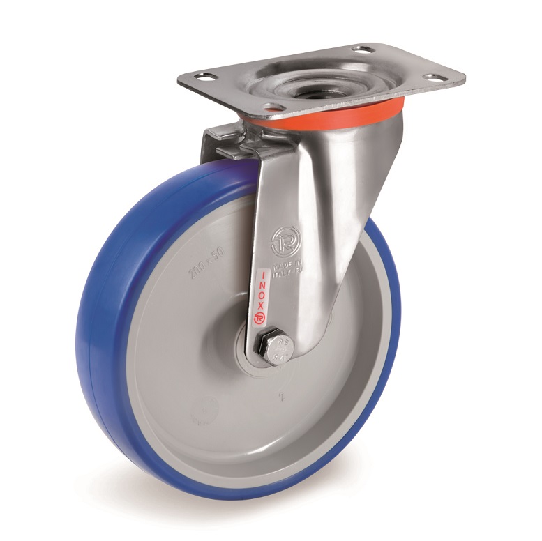 Κατάλληλο για καρότσια και τα μηχανήματα με τα φορτία μεσαίου βαθμου, Κατάλληλο για εσωτερική και εξωτερική χρήση για συχνό πλύσιμο και αποστείρωση.Εξαιρετική αντίσταση κύλισης.Παραδείγματα συνιστώμενες εφαρμογές: καρότσια για βιομηχανική χρήση σε εσωτερικούς χώρους, σωληνοειδή καρότσια, καρότσια για τη βιομηχανία τροφίμων και χημικών.ΡΟΔΑ:Θερμοπλαστική πολυουρεθάνη.ΠΕΛΜΑ:INOX