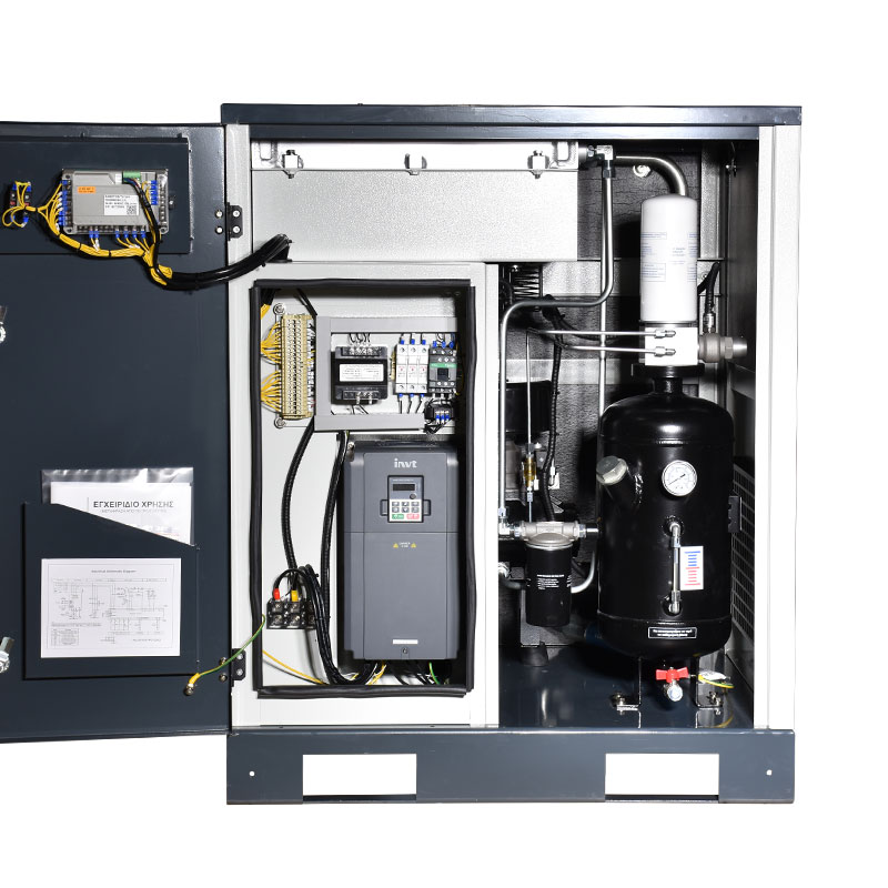 - Επιπλέον διαθέτουν πίνακα ψηφιακού ελέγχου με οθόνη αφής, για αναλυτική παρακολούθηση και έλεγχο των κύριων λειτουργιών του αεροσυμπιεστή και των πληροφοριών συντήρησης (Κάθε 2500 ώρες).